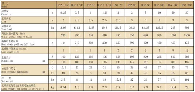 0.25t-1.5tHSZ-C型武林飞鸽手拉葫芦性能参数表: