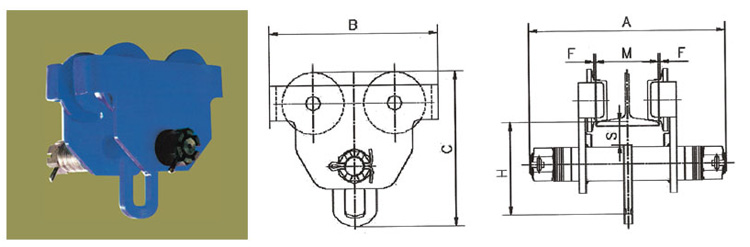 小车的左、右墙板上分别装有车轮,挂梁穿过左、右墙板,用螺母紧固。吊环装置在挂梁中,手拉葫芦即悬挂在吊环上。